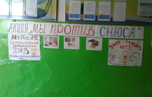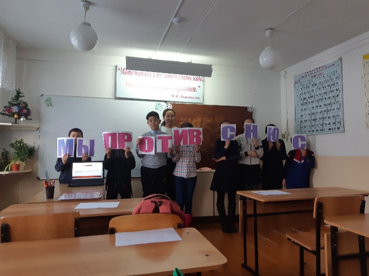 15 января в школах Дзун-Хемчикского кожууна объявлена акция «Мы против СНЮС!». В данном мероприятии классные руководители провели классные часы, лекции, беседы и диспуты на тему « СНЮС-это зло!». Кроме того школьникам показывали видеоролики где наглядно объясняется вред употребления снюса. Педагогами-психологами совместно с юными помощниками педагога-психолога проведены психологические занятия, тренинги среди учащихся с 5 по 11 классов, с общим охватом 1246 детей. Психологи обучали учащихся умению противостоять чужому давлению, выражать отказ оптимальными способами, отрабатывать навыкам уверенного поведения и отстаивания своей позиции.